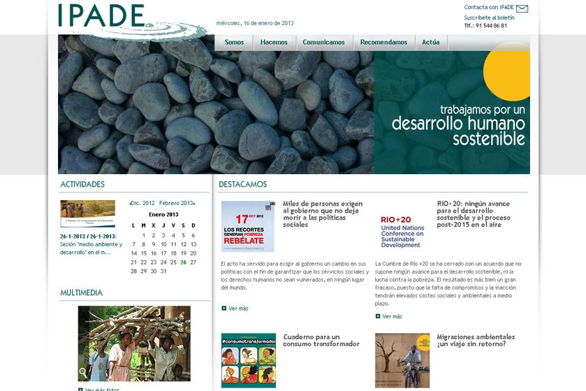 Desarrollo de sitio web de altas prestaciones para la Fundación Ipade. La aplicación permite almacenar toda la información actualizada relativa a la ONGD y su actividad en el mundo. Edición y publicación de noticias, seguimiento y publicación de actividades, dossier de prensa, gestión, edición y publicación de notas de prensa (administrables y envío a medios) suscripción a boletín periódico (del cual también realizamos el envío mensual) y área multimedia con galerías de imágenes, vídeos y audios.