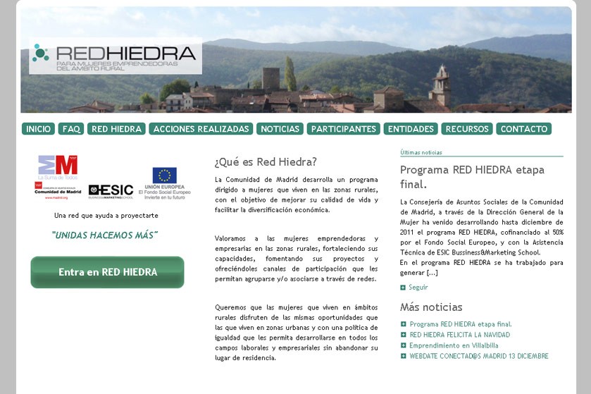 Desarrollo de sitio web para el programa impulsado por la Comunidad de Madrid y coordinado por ESIC: Red Hiedra. El sitio permite la recopilación de referencias a emprendedores en el área rural de la Comunidad. Web directorio.